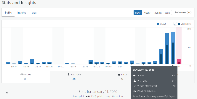 My website is primarily an Education based website, with tips and resources for teaches of English and some STEM ( science) lessons. It also has Education apps on it that draw most of my views. It was getting about 10 to 30 views a day from Google search and people coming from inside the apps. So very small and very steady.